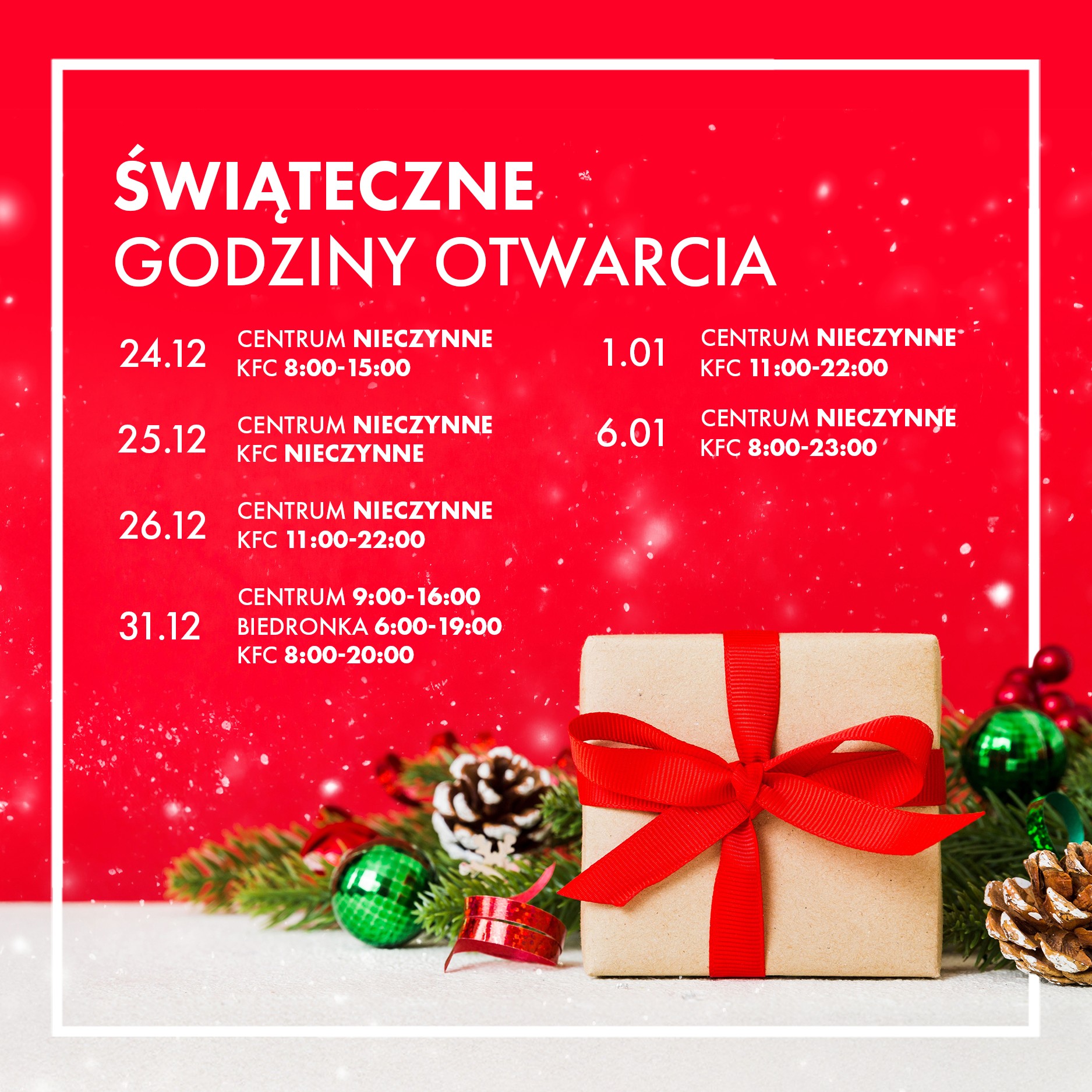 W okresie świąteczno-noworocznym centrum będzie funkcjonować w zmienionych godzinach. Wybrane lokale m.in Biedronka oraz KFC – również pracują według specjalnego harmonogramu.